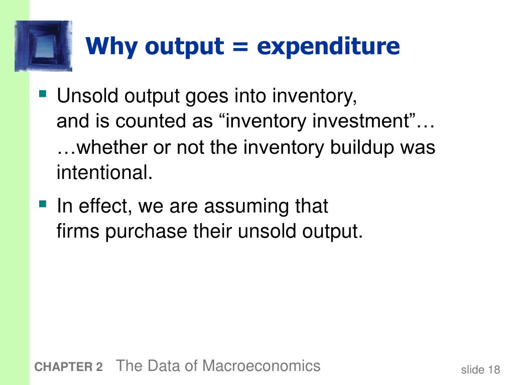 Why output = expenditure • Unsold output goes into inventory, and is counted as “inventory investment”… …whether or not the inventory buildup was intentional. • In effect, we are assuming that firms purchase their unsold output. CHAPTER 2 The Data of Macroeconomics