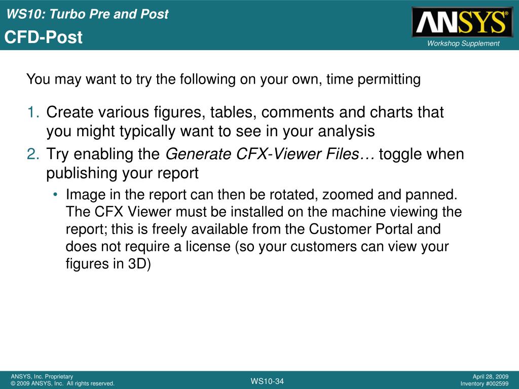 CFD-Post • Create various figures, tables, comments and charts that you might typically want to see in your analysis • Try enabling the Generate CFX-Viewer Files… toggle when publishing your report • Image in the report can then be rotated, zoomed and panned. The CFX Viewer must be installed on the machine viewing the report; this is freely available from the Customer Portal and does not require a license (so your customers can view your figures in 3D) You may want to try the following on your own, time permitting