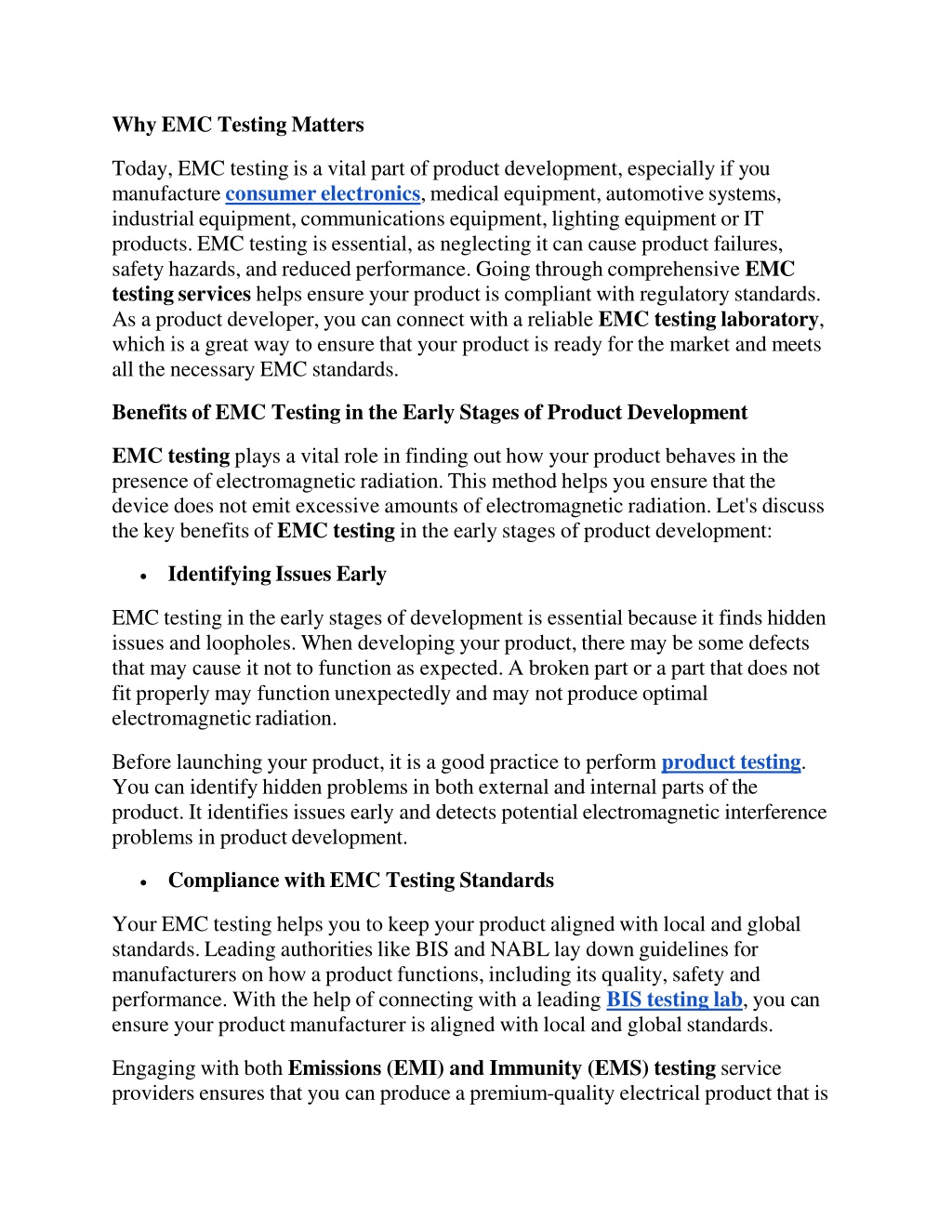 WhyEMCTestingMatters • Today,EMCtestingisavitalpartofproductdevelopment,especiallyif you manufactureconsumerelectronics,medicalequipment,automotivesystems, industrialequipment,communicationsequipment,lightingequipmentorIT products.EMCtestingisessential,asneglectingitcancauseproductfailures, safetyhazards,andreducedperformance.Goingthroughcomprehensive EMC testingserviceshelpsensureyourproductiscompliantwithregulatorystandards. Asaproductdeveloper,youcanconnectwithareliable EMCtestinglaboratory, whichisagreatwaytoensurethatyourproductisreadyforthemarketandmeets allthenecessaryEMCstandards. • BenefitsofEMCTestingintheEarlyStagesofProductDevelopment • EMCtestingplaysavitalroleinfindingouthowyourproductbehavesinthe presenceofelectromagneticradiation.Thismethodhelpsyouensurethatthe devicedoesnotemitexcessiveamountsofelectromagneticradiation.Let'sdiscuss thekeybenefitsofEMCtestingintheearlystagesofproductdevelopment: • IdentifyingIssuesEarly • EMCtestingintheearlystagesofdevelopmentisessentialbecauseitfindshidden issuesandloopholes.Whendevelopingyourproduct,theremaybesomedefects thatmaycauseitnotto functionasexpected.Abrokenpartorapartthatdoesnot fitproperlymayfunctionunexpectedlyandmaynotproduceoptimal electromagneticradiation. • Beforelaunchingyourproduct,itisagoodpracticetoperformproducttesting. Youcanidentifyhiddenproblemsinbothexternalandinternalpartsoftheproduct.Itidentifiesissuesearlyanddetectspotentialelectromagneticinterference problemsinproductdevelopment. • CompliancewithEMCTestingStandards • YourEMCtestinghelpsyoutokeepyourproductalignedwithlocalandglobal standards.LeadingauthoritieslikeBISandNABLlaydownguidelinesfor manufacturersonhowaproductfunctions,includingitsquality,safety and performance.WiththehelpofconnectingwithaleadingBIStestinglab,youcan ensureyourproductmanufacturerisalignedwithlocalandglobalstandards. • EngagingwithbothEmissions(EMI)andImmunity(EMS)testingservice providersensuresthatyoucanproduceapremium-qualityelectricalproductthat is