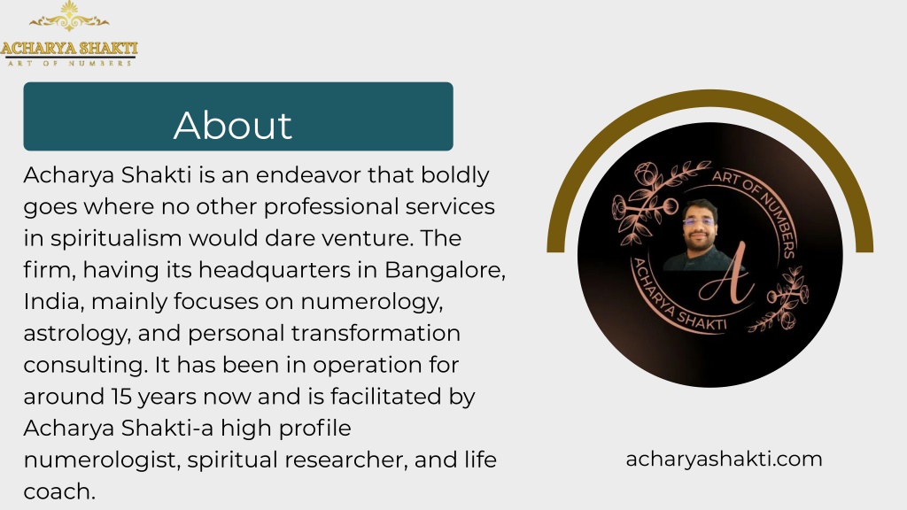 About Acharya Shakti is an endeavor that boldly goes where no other professional services in spiritualism would dare venture. The firm, having its headquarters in Bangalore, India, mainly focuses on numerology, astrology, and personal transformation consulting. It has been in operation for around 15 years now and is facilitated by Acharya Shakti-a high profile numerologist, spiritual researcher, and life coach. acharyashakti.com