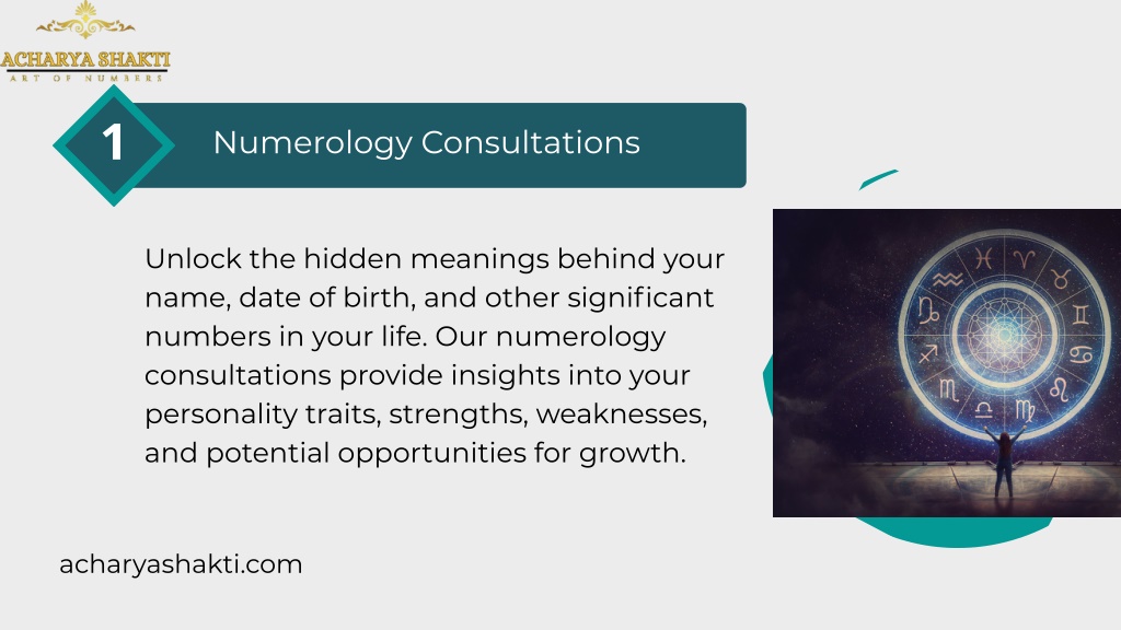 1 Numerology Consultations Unlock the hidden meanings behind your name, date of birth, and other significant numbers in your life. Our numerology consultations provide insights into your personality traits, strengths, weaknesses, and potential opportunities for growth. acharyashakti.com