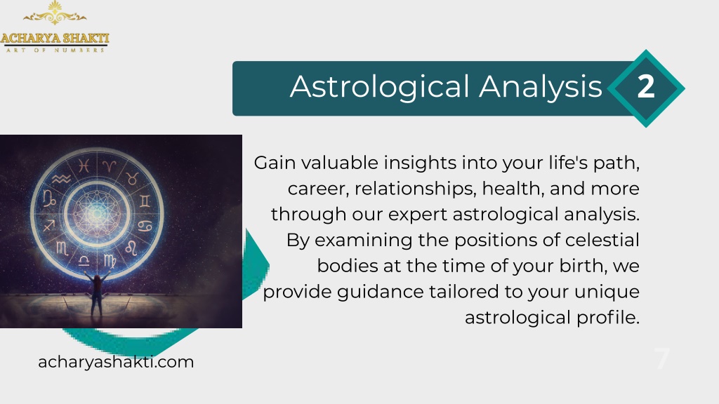 2 Astrological Analysis Gain valuable insights into your life's path, career, relationships, health, and more through our expert astrological analysis. By examining the positions of celestial bodies at the time of your birth, we provide guidance tailored to your unique astrological profile. 7 acharyashakti.com