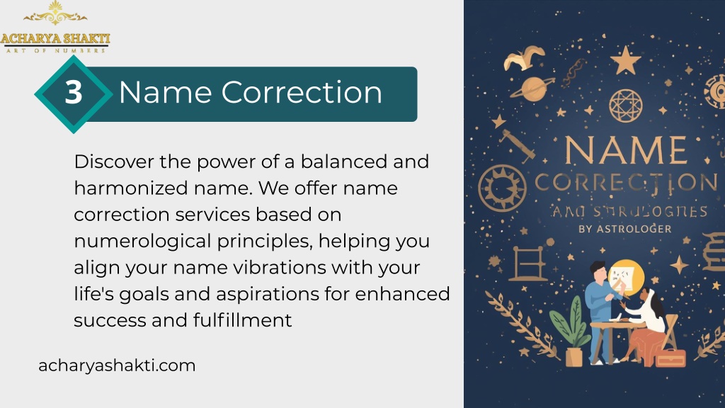 3 Name Correction Discover the power of a balanced and harmonized name. We offer name correction services based on numerological principles, helping you align your name vibrations with your life's goals and aspirations for enhanced success and fulfillment acharyashakti.com