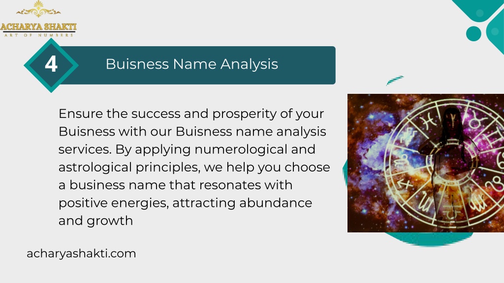 4 Buisness Name Analysis Ensure the success and prosperity of your Buisness with our Buisness name analysis services. By applying numerological and astrological principles, we help you choose a business name that resonates with positive energies, attracting abundance and growth acharyashakti.com