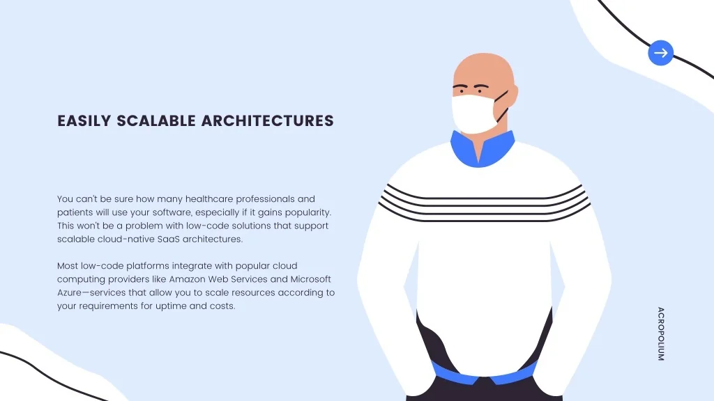 EASILY SCALABLE ARCHITECTURES You can’t be sure how many healthcare professionals and patients will use your software, especially if it gains popularity. This won’t be a problem with low-code solutions that support scalable cloud-native SaaS architectures. Most low-code platforms integrate with popular cloud computing providers like Amazon Web Services and Microsoft Azure—services that allow you to scale resources according to your requirements for uptime and costs. ACROPOLIUM