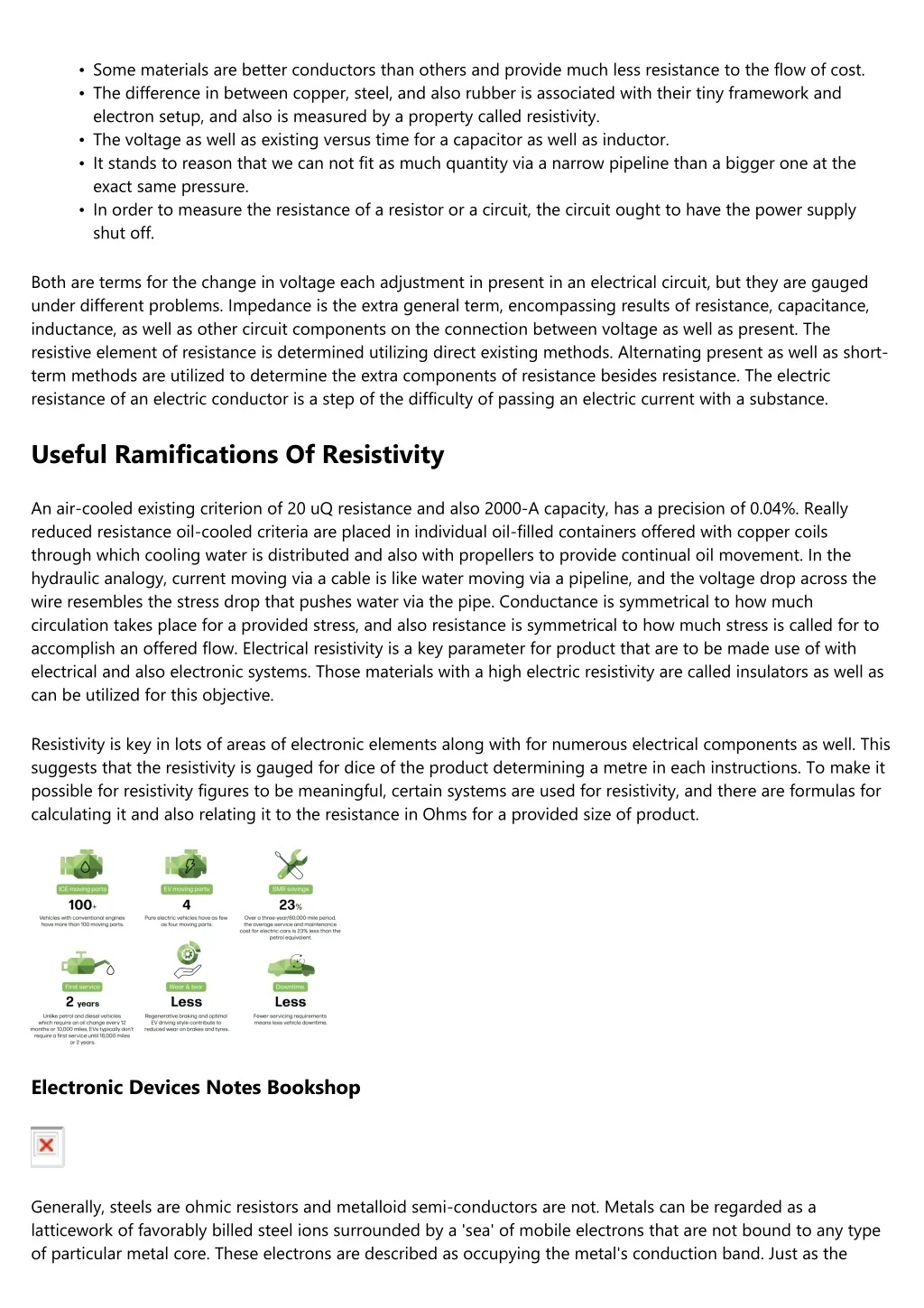 • • Some materials are better conductors than others and provide much less resistance to the flow of cost. The difference in between copper, steel, and also rubber is associated with their tiny framework and electron setup, and also is measured by a property called resistivity. The voltage as well as existing versus time for a capacitor as well as inductor. It stands to reason that we can not fit as much quantity via a narrow pipeline than a bigger one at the exact same pressure. In order to measure the resistance of a resistor or a circuit, the circuit ought to have the power supply shut off. • • • Both are terms for the change in voltage each adjustment in present in an electrical circuit, but they are gauged under different problems. Impedance is the extra general term, encompassing results of resistance, capacitance, inductance, as well as other circuit components on the connection between voltage as well as present. The resistive element of resistance is determined utilizing direct existing methods. Alternating present as well as short- term methods are utilized to determine the extra components of resistance besides resistance. The electric resistance of an electric conductor is a step of the difficulty of passing an electric current with a substance. Useful Ramifications Of Resistivity An air-cooled existing criterion of 20 uQ resistance and also 2000-A capacity, has a precision of 0.04%. Really reduced resistance oil-cooled criteria are placed in individual oil-filled containers offered with copper coils through which cooling water is distributed and also with propellers to provide continual oil movement. In the hydraulic analogy, current moving via a cable is like water moving via a pipeline, and the voltage drop across the wire resembles the stress drop that pushes water via the pipe. Conductance is symmetrical to how much circulation takes place for a provided stress, and also resistance is symmetrical to how much stress is called for to accomplish an offered flow. Electrical resistivity is a key parameter for product that are to be made use of with electrical and also electronic systems. Those materials with a high electric resistivity are called insulators as well as can be utilized for this objective. Resistivity is key in lots of areas of electronic elements along with for numerous electrical components as well. This suggests that the resistivity is gauged for dice of the product determining a metre in each instructions. To make it possible for resistivity figures to be meaningful, certain systems are used for resistivity, and there are formulas for calculating it and also relating it to the resistance in Ohms for a provided size of product. Electronic Devices Notes Bookshop Generally, steels are ohmic resistors and metalloid semi-conductors are not. Metals can be regarded as a latticework of favorably billed steel ions surrounded by a 'sea' of mobile electrons that are not bound to any type of particular metal core. These electrons are described as occupying the metal's conduction band. Just as the