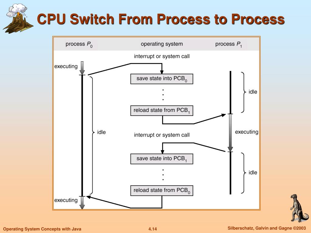 Context Switch The context of a process is represented by the PCB of the process (process descriptor) • When CPU switches to another process, the system must save the state of the old process and load the saved state for the new process • Context-switch time is overhead; the system does no useful work while switching • Time dependent on hardware support (some processors have multiple set of registers. Each set can be used for a process to store its state. Context switch changing the pointer to the current register set in this case if there are enough sets.