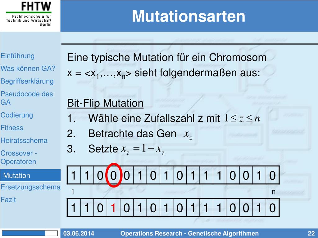 Mutation Mutationen dienen zum verhindern einer frühzeitigen Konvergenz (premature convergence), und um eine gewisse Divergenz und Inhomogenität der Population zu sorgen. Ziel Findung gänzlich anderer Lösungen - also Lösungen, die mit der Kreuzung allein nicht generiert werden können. Mutation Operations Research - Genetische Algorithmen