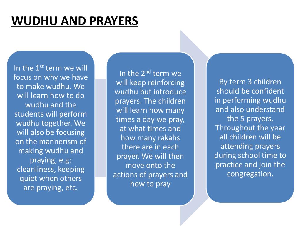 Islamic Practices Teaching the students to always remember Allah throughout the day with Islamic practices such as: what we say before we eat, how we greet people, and how we should treat each another. We will also be learning one Du’aevery term, e.g.; Du’awe say when entering the morning.