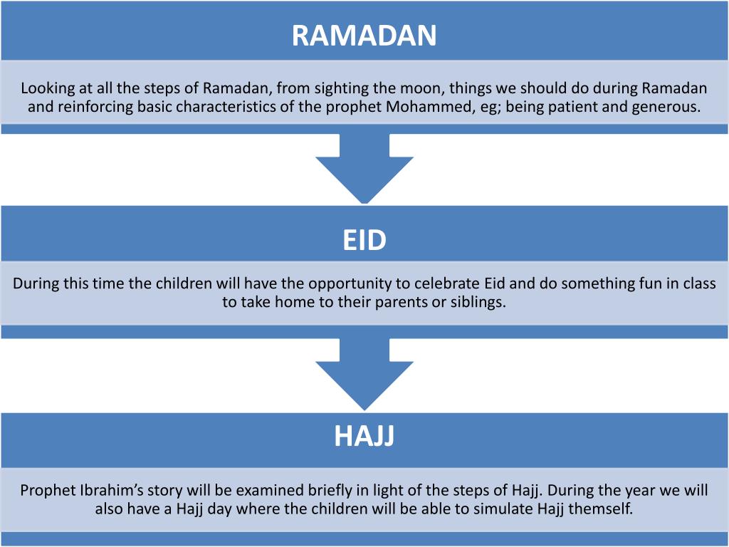 Looking at all the steps of Ramadan, from sighting the moon, things we should do during Ramadan and reinforcing basic characteristics of the prophet Mohammed, eg; being patient and generous. • RAMADAN • EID • During this time the children will have the opportunity to celebrate Eid and do something fun in class to take home to their parents or siblings. HAJJ • Prophet Ibrahim’s story will be examined briefly in light of the steps of Hajj. During the year we will also have a Hajj day where the children will be able to simulate Hajj themself.