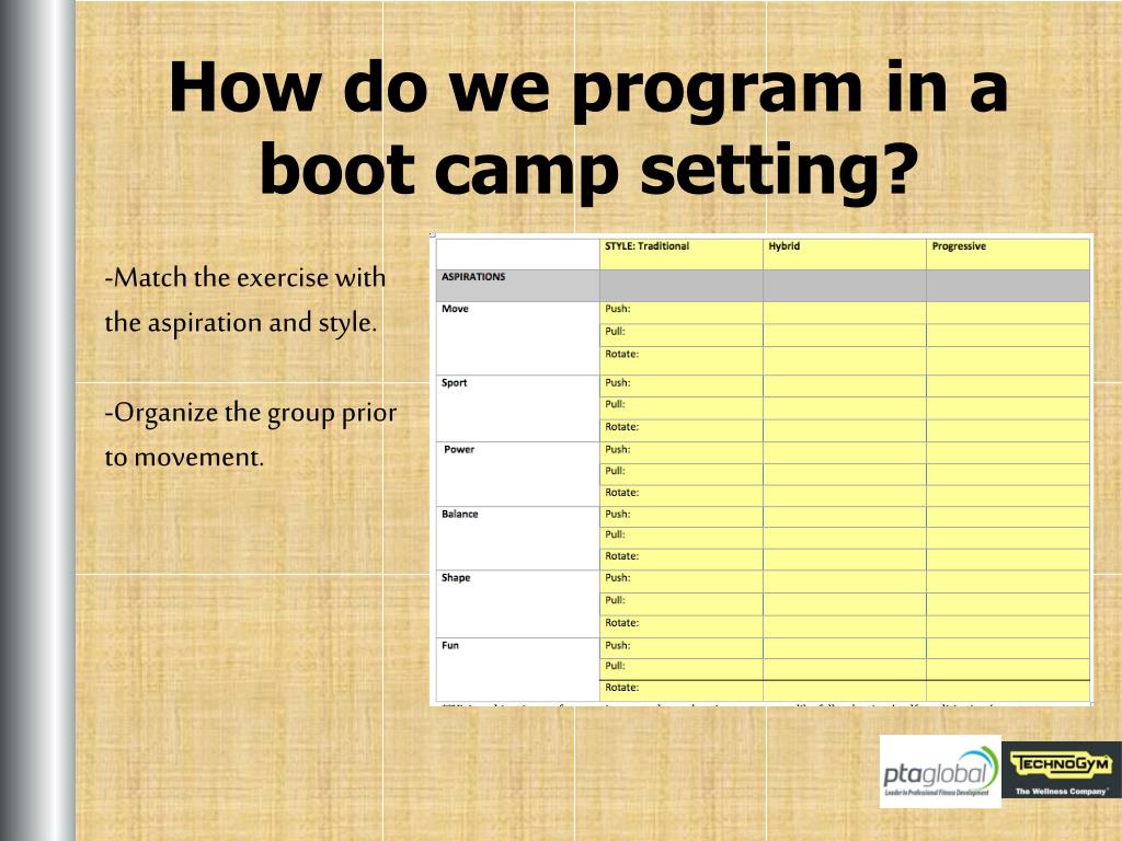 How do we program in a boot camp setting? -Match the exercise with the aspiration and style. -Organize the group prior to movement.