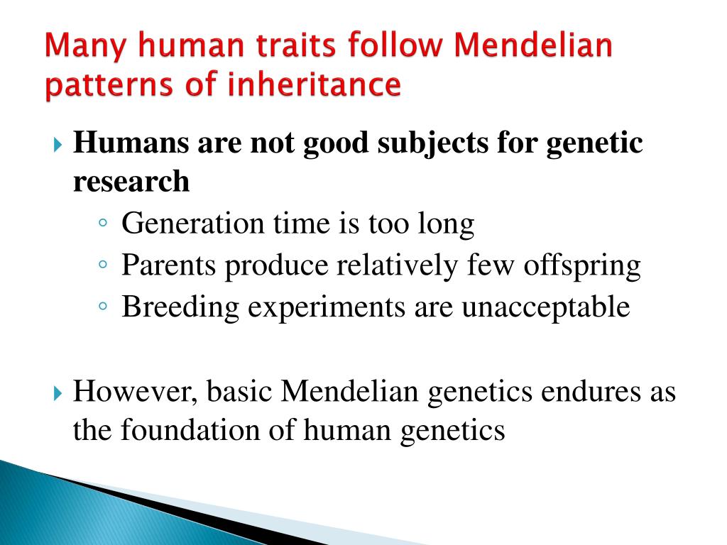 Many human traits follow Mendelian patterns of inheritance • Humans are not good subjects for genetic research • Generation time is too long • Parents produce relatively few offspring • Breeding experiments are unacceptable • However, basic Mendelian genetics endures as the foundation of human genetics