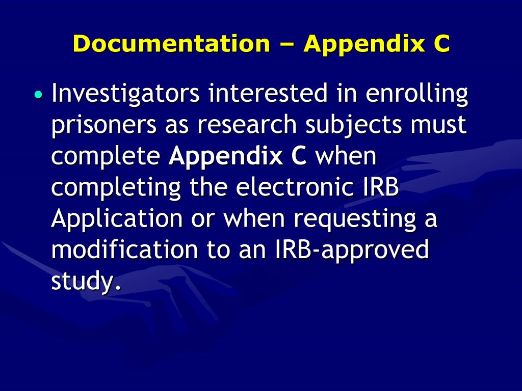 Documentation – Appendix C • Investigators interested in enrolling prisoners as research subjects must complete Appendix C when completing the electronic IRB Application or when requesting a modification to an IRB-approved study.