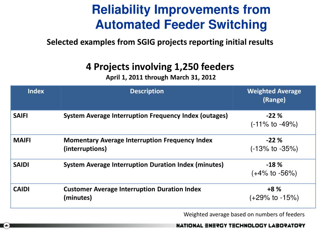Reliability Improvements from Automated Feeder Switching Selected examples from SGIG projects reporting initial results 4 Projects involving 1,250 feeders April 1, 2011 through March 31, 2012 Weighted average based on numbers of feeders
