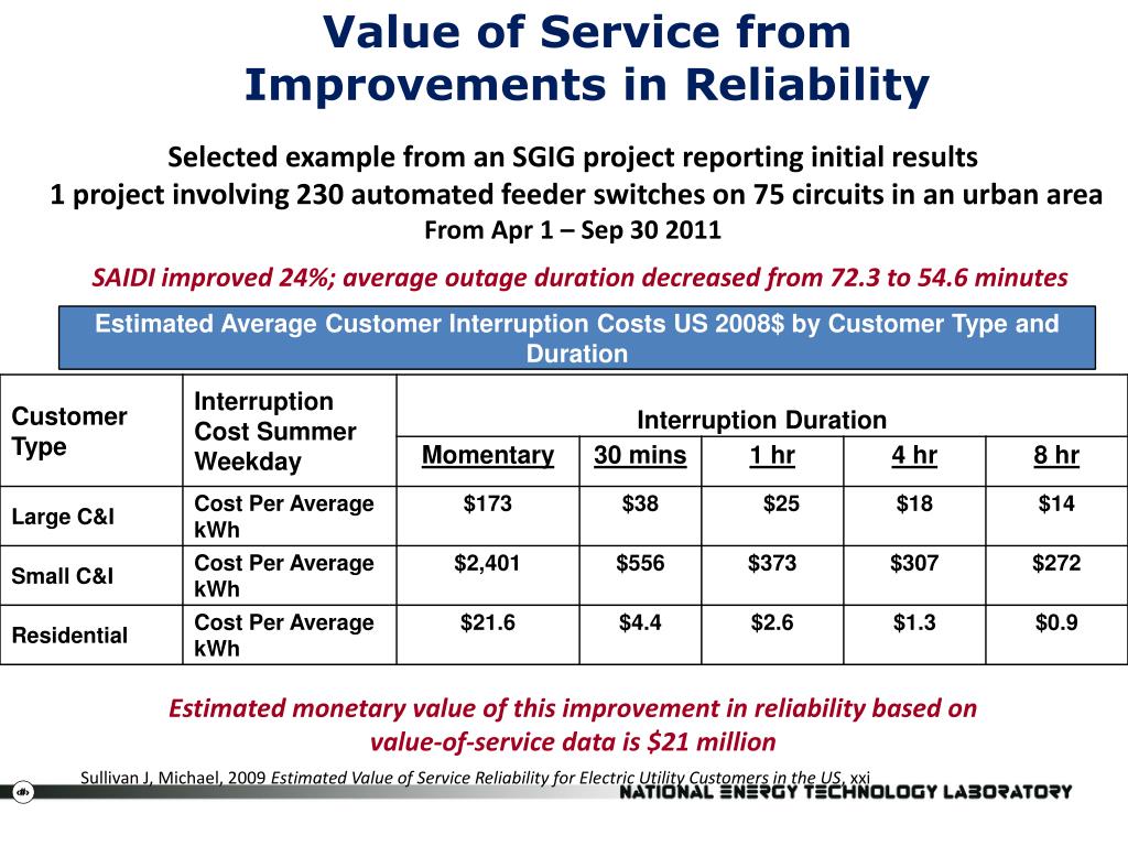 Value of Service from Improvements in Reliability Selected example from an SGIG project reporting initial results 1 project involving 230 automated feeder switches on 75 circuits in an urban area From Apr 1 – Sep 30 2011 SAIDI improved 24%; average outage duration decreased from 72.3 to 54.6 minutes Estimated Average Customer Interruption Costs US 2008$ by Customer Type and Duration Estimated monetary value of this improvement in reliability based on value-of-service data is $21 million Sullivan J, Michael, 2009 Estimated Value of Service Reliability for Electric Utility Customers in the US, xxi