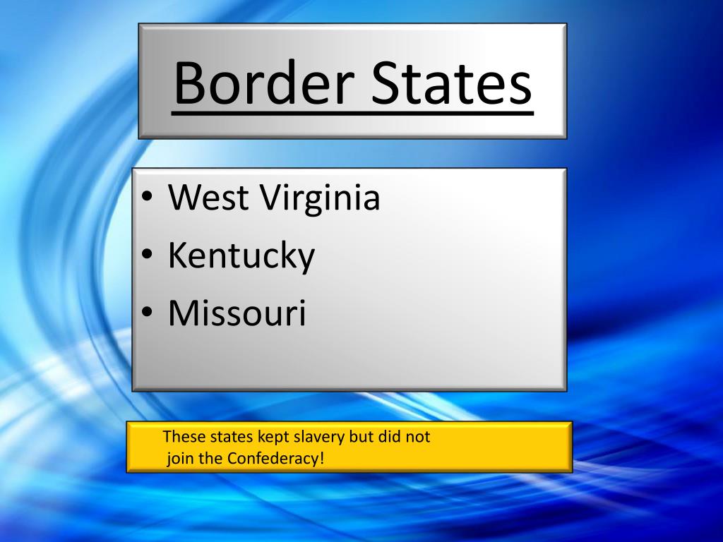 Border States • West Virginia • Kentucky • Missouri These states kept slavery but did not join the Confederacy!