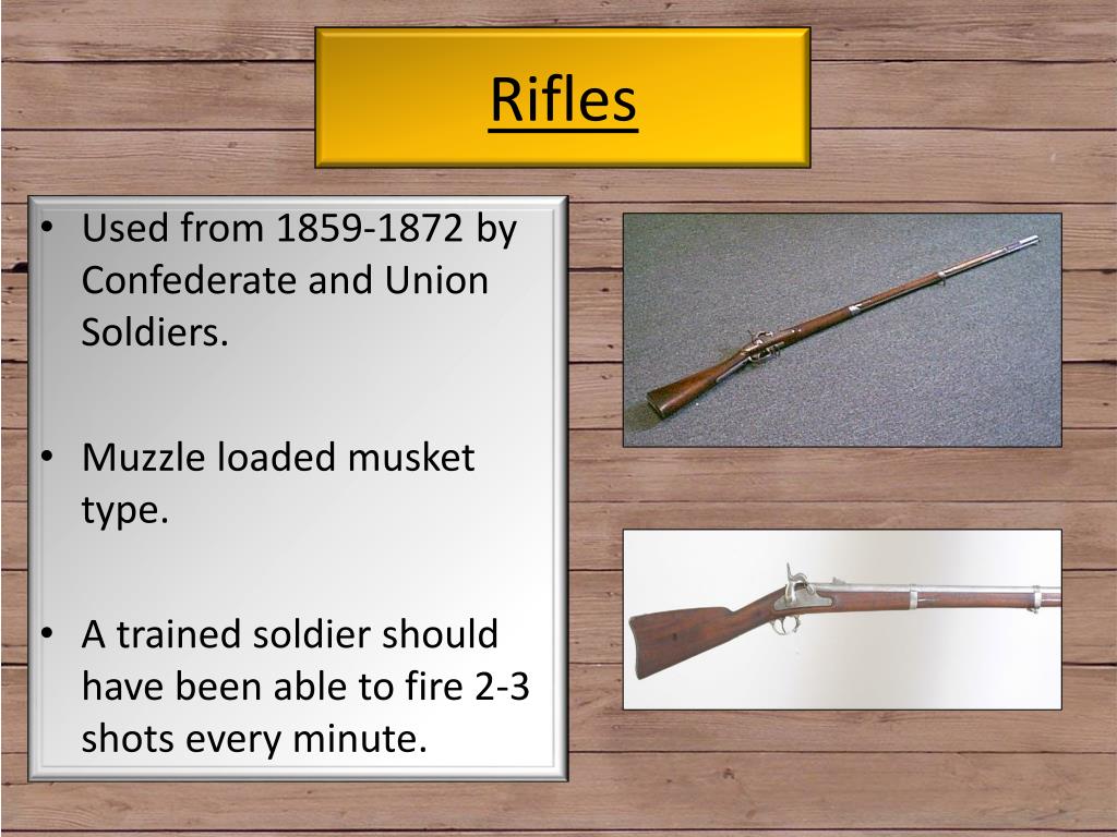 Rifles • Used from 1859-1872 by Confederate and Union Soldiers. • Muzzle loaded musket type. • A trained soldier should have been able to fire 2-3 shots every minute.