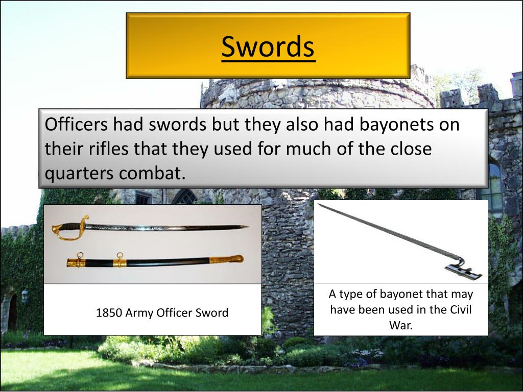 Swords 1850 Army Officer Sword Officers had swords but they also had bayonets on their rifles that they used for much of the close quarters combat. A type of bayonet that may have been used in the Civil War.