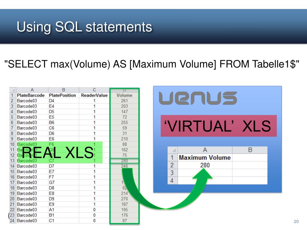 Using SQL statements In VENUS, SQL canbeused in thefile/datahandlingto: FILTER Data Example: Get all OD valuesfrom a readerhigherthan 25 SORT Data Example: Sortthevolumes intheoutput in ascendingorder