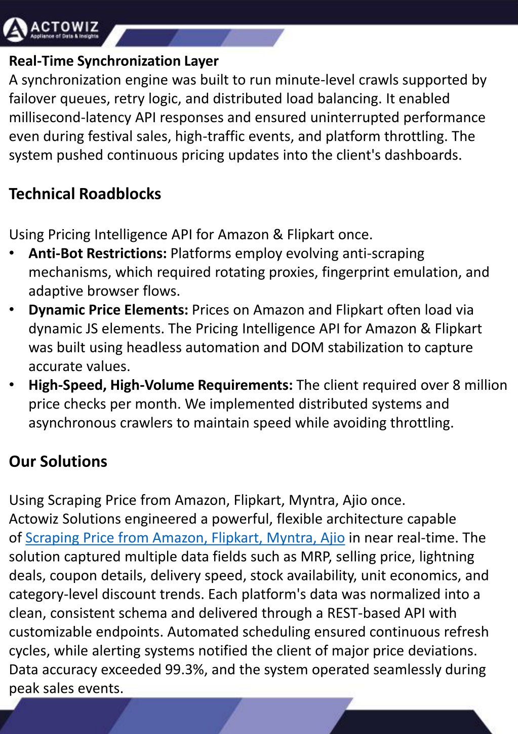 Real-Time Synchronization Layer • A synchronization engine was built to run minute-level crawls supported by failover queues, retry logic, and distributed load balancing. It enabled millisecond-latency API responses and ensured uninterrupted performance even during festival sales, high-traffic events, and platform throttling. The system pushed continuous pricing updates into the client's dashboards. • Technical Roadblocks • Using Pricing Intelligence API for Amazon & Flipkart once. • Anti-Bot Restrictions: Platforms employ evolving anti-scraping mechanisms, which required rotating proxies, fingerprint emulation, and adaptive browser flows. • Dynamic Price Elements: Prices on Amazon and Flipkart often load via dynamic JS elements. The Pricing Intelligence API for Amazon & Flipkart was built using headless automation and DOM stabilization to capture accurate values. • High-Speed, High-Volume Requirements: The client required over 8 million price checks per month. We implemented distributed systems and asynchronous crawlers to maintain speed while avoiding throttling. • Our Solutions • Using Scraping Price from Amazon, Flipkart, Myntra, Ajio once. • Actowiz Solutions engineered a powerful, flexible architecture capable of Scraping Price from Amazon, Flipkart, Myntra, Ajio in near real-time. The solution captured multiple data fields such as MRP, selling price, lightning deals, coupon details, delivery speed, stock availability, unit economics, and category-level discount trends. Each platform's data was normalized into a clean, consistent schema and delivered through a REST-based API with customizable endpoints. Automated scheduling ensured continuous refresh cycles, while alerting systems notified the client of major price deviations. Data accuracy exceeded 99.3%, and the system operated seamlessly during peak sales events. Extracting Information from TripAdvisor: A Guide to Scraping Data from Hotels and Restaurants How to Effectively Use Competitor Price Trackers: Operational Guidance and Benefits How to Use Zomato API to Scrape Restaurant Data – A Detailed Guide What are Datasets? - A Comprehensive Guide Introduction Introduction This blog will provide a comprehensive overview of datasets, including their definition, different types of datasets, and strategies for maximizing the value of data. Leveraging the appropriate API makes scraping TripAdvisor on a large scale a straightforward task. You don't need to possess advanced computer skills to achieve this. Our comprehensive, step-by-step guide is designed to walk you through extracting data from TripAdvisor using a user-friendly web scraping tool. In the dynamic landscape of eCommerce, pricing strategy stands paramount, especially for digital storefronts. Modern consumers are discerning, often prioritizing price comparison as a pivotal step before purchasing. The allure of securing the best deals and most competitive prices drives this behavior. Consequently, a significant portion of online shoppers actively engage in price monitoring across various platforms. Recognizing this trend, online retailers must adeptly employ competitor price trackers to stay ahead. What is a Dataset? Introduction In the dynamic world of digital gastronomy, where culinary delights and dining experiences are increasingly explored and celebrated online, the demand for up-to-date restaurant data is insatiable. As food enthusiasts and businesses seek the latest insights into menus, reviews, and more, the Zomato API emerges as a powerful tool for scraping this invaluable information. TripAdvisor stands out as a powerhouse with an extensive database comprising over 8 million locations, 1 billion reviews, and support for 29 languages. As of 2022, when the cumulative reviews surpassed the one billion mark, it became evident that TripAdvisor's meticulous gaze would soon cover every restaurant, hotel, vacation rental, or attraction listing. By leveraging retail data scraping techniques, businesses can collect comprehensive retail data, offering insights into the broader market's pricing landscape. Such price intelligence empowers retailers to craft a robust pricing strategy, bolstering sales, enhancing profit margins, and fostering customer loyalty. Moreover, a data-driven eCommerce pricing approach ensures competitiveness, with dynamic pricing becoming increasingly prevalent. Unlocking the Potential: The Advantages of Scraping TripAdvisor Data Our comprehensive guide delves into the intricate art of utilizing the Zomato API to scrape restaurant data. Whether you're a restaurateur striving to understand your competitors, a food blogger searching for fresh content, or a data enthusiast eager to explore culinary trends, this guide will serve as your compass in the world of data extraction. In essence, utilizing a competent competitor price tracker facilitates effective pricing optimization and solidifies a retailer's position in the fiercely competitive eCommerce arena. Amidst TripAdvisor's vast sea of information lies a treasure trove awaiting extraction, analysis, and innovative presentation. For those in the tourism, hospitality, or travel sectors, harnessing TripAdvisor data proves invaluable for monitoring competitors and supporting strategic business decisions. The TripAdvisor Scraper facilitates seamless and rapid web scraping, offering the most straightforward route to consistently obtaining data at scale. This article delves into the myriad benefits of scraping TripAdvisor, shedding light on how this process can be initiated, including exploring the initial steps involving API utilization. Dive into the realm of data-driven insights with TripAdvisor scraping. We will navigate through the intricacies of Zomato Scraper, uncovering its capabilities to provide you with rich, real-time restaurant data. From scraping restaurant details to accessing customer reviews, our detailed guide ensures that you harness the full potential of this resource.
