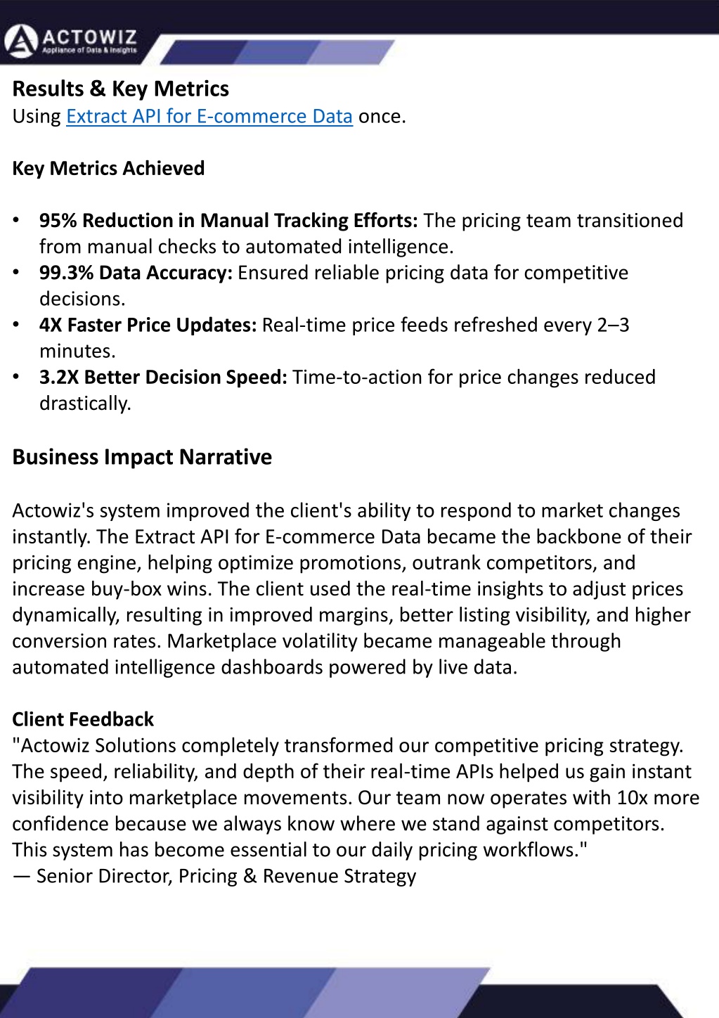 Results & Key Metrics • Using Extract API for E-commerce Data once. • Key Metrics Achieved • 95% Reduction in Manual Tracking Efforts: The pricing team transitioned from manual checks to automated intelligence. • 99.3% Data Accuracy: Ensured reliable pricing data for competitive decisions. • 4X Faster Price Updates: Real-time price feeds refreshed every 2–3 minutes. • 3.2X Better Decision Speed: Time-to-action for price changes reduced drastically. • Business Impact Narrative • Actowiz's system improved the client's ability to respond to market changes instantly. The Extract API for E-commerce Data became the backbone of their pricing engine, helping optimize promotions, outrank competitors, and increase buy-box wins. The client used the real-time insights to adjust prices dynamically, resulting in improved margins, better listing visibility, and higher conversion rates. Marketplace volatility became manageable through automated intelligence dashboards powered by live data. • Client Feedback • "Actowiz Solutions completely transformed our competitive pricing strategy. The speed, reliability, and depth of their real-time APIs helped us gain instant visibility into marketplace movements. Our team now operates with 10x more confidence because we always know where we stand against competitors. This system has become essential to our daily pricing workflows." • — Senior Director, Pricing & Revenue Strategy Extracting Information from TripAdvisor: A Guide to Scraping Data from Hotels and Restaurants How to Effectively Use Competitor Price Trackers: Operational Guidance and Benefits How to Use Zomato API to Scrape Restaurant Data – A Detailed Guide What are Datasets? - A Comprehensive Guide Introduction Introduction This blog will provide a comprehensive overview of datasets, including their definition, different types of datasets, and strategies for maximizing the value of data. Leveraging the appropriate API makes scraping TripAdvisor on a large scale a straightforward task. You don't need to possess advanced computer skills to achieve this. Our comprehensive, step-by-step guide is designed to walk you through extracting data from TripAdvisor using a user-friendly web scraping tool. In the dynamic landscape of eCommerce, pricing strategy stands paramount, especially for digital storefronts. Modern consumers are discerning, often prioritizing price comparison as a pivotal step before purchasing. The allure of securing the best deals and most competitive prices drives this behavior. Consequently, a significant portion of online shoppers actively engage in price monitoring across various platforms. Recognizing this trend, online retailers must adeptly employ competitor price trackers to stay ahead. What is a Dataset? Introduction In the dynamic world of digital gastronomy, where culinary delights and dining experiences are increasingly explored and celebrated online, the demand for up-to-date restaurant data is insatiable. As food enthusiasts and businesses seek the latest insights into menus, reviews, and more, the Zomato API emerges as a powerful tool for scraping this invaluable information. TripAdvisor stands out as a powerhouse with an extensive database comprising over 8 million locations, 1 billion reviews, and support for 29 languages. As of 2022, when the cumulative reviews surpassed the one billion mark, it became evident that TripAdvisor's meticulous gaze would soon cover every restaurant, hotel, vacation rental, or attraction listing. By leveraging retail data scraping techniques, businesses can collect comprehensive retail data, offering insights into the broader market's pricing landscape. Such price intelligence empowers retailers to craft a robust pricing strategy, bolstering sales, enhancing profit margins, and fostering customer loyalty. Moreover, a data-driven eCommerce pricing approach ensures competitiveness, with dynamic pricing becoming increasingly prevalent. Unlocking the Potential: The Advantages of Scraping TripAdvisor Data Our comprehensive guide delves into the intricate art of utilizing the Zomato API to scrape restaurant data. Whether you're a restaurateur striving to understand your competitors, a food blogger searching for fresh content, or a data enthusiast eager to explore culinary trends, this guide will serve as your compass in the world of data extraction. In essence, utilizing a competent competitor price tracker facilitates effective pricing optimization and solidifies a retailer's position in the fiercely competitive eCommerce arena. Amidst TripAdvisor's vast sea of information lies a treasure trove awaiting extraction, analysis, and innovative presentation. For those in the tourism, hospitality, or travel sectors, harnessing TripAdvisor data proves invaluable for monitoring competitors and supporting strategic business decisions. The TripAdvisor Scraper facilitates seamless and rapid web scraping, offering the most straightforward route to consistently obtaining data at scale. This article delves into the myriad benefits of scraping TripAdvisor, shedding light on how this process can be initiated, including exploring the initial steps involving API utilization. Dive into the realm of data-driven insights with TripAdvisor scraping. We will navigate through the intricacies of Zomato Scraper, uncovering its capabilities to provide you with rich, real-time restaurant data. From scraping restaurant details to accessing customer reviews, our detailed guide ensures that you harness the full potential of this resource.