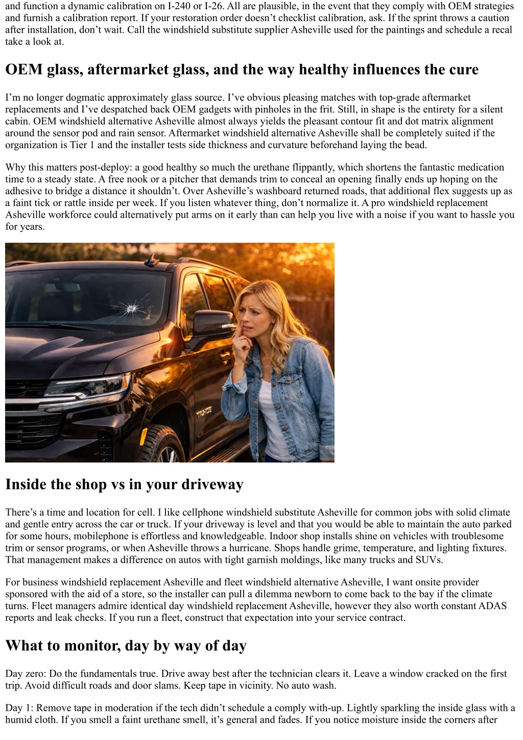 and function a dynamic calibration on I-240 or I-26. All are plausible, in the event that they comply with OEM strategies and furnish a calibration report. If your restoration order doesn’t checklist calibration, ask. If the sprint throws a caution after installation, don’t wait. Call the windshield substitute supplier Asheville used for the paintings and schedule a recal take a look at. OEM glass, aftermarket glass, and the way healthy influences the cure I’m no longer dogmatic approximately glass source. I’ve obvious pleasing matches with top-grade aftermarket replacements and I’ve despatched back OEM gadgets with pinholes in the frit. Still, in shape is the entirety for a silent cabin. OEM windshield alternative Asheville almost always yields the pleasant contour fit and dot matrix alignment around the sensor pod and rain sensor. Aftermarket windshield alternative Asheville shall be completely suited if the organization is Tier 1 and the installer tests side thickness and curvature beforehand laying the bead. Why this matters post-deploy: a good healthy so much the urethane flippantly, which shortens the fantastic medication time to a steady state. A free nook or a pitcher that demands trim to conceal an opening finally ends up hoping on the adhesive to bridge a distance it shouldn’t. Over Asheville’s washboard returned roads, that additional flex suggests up as a faint tick or rattle inside per week. If you listen whatever thing, don’t normalize it. A pro windshield replacement Asheville workforce could alternatively put arms on it early than can help you live with a noise if you want to hassle you for years. Inside the shop vs in your driveway There’s a time and location for cell. I like cellphone windshield substitute Asheville for common jobs with solid climate and gentle entry across the car or truck. If your driveway is level and that you would be able to maintain the auto parked for some hours, mobilephone is effortless and knowledgeable. Indoor shop installs shine on vehicles with troublesome trim or sensor programs, or when Asheville throws a hurricane. Shops handle grime, temperature, and lighting fixtures. That management makes a difference on autos with tight garnish moldings, like many trucks and SUVs. For business windshield replacement Asheville and fleet windshield alternative Asheville, I want onsite provider sponsored with the aid of a store, so the installer can pull a dilemma newborn to come back to the bay if the climate turns. Fleet managers admire identical day windshield replacement Asheville, however they also worth constant ADAS reports and leak checks. If you run a fleet, construct that expectation into your service contract. What to monitor, day by way of day Day zero: Do the fundamentals true. Drive away best after the technician clears it. Leave a window cracked on the first trip. Avoid difficult roads and door slams. Keep tape in vicinity. No auto wash. Day 1: Remove tape in moderation if the tech didn’t schedule a comply with-up. Lightly sparkling the inside glass with a humid cloth. If you smell a faint urethane smell, it’s general and fades. If you notice moisture inside the corners after
