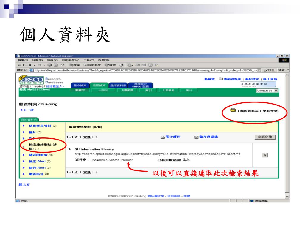 個人資料夾:除了放檢索的文章,還可以存放檢索結果的快速連結個人資料夾:除了放檢索的文章,還可以存放檢索結果的快速連結