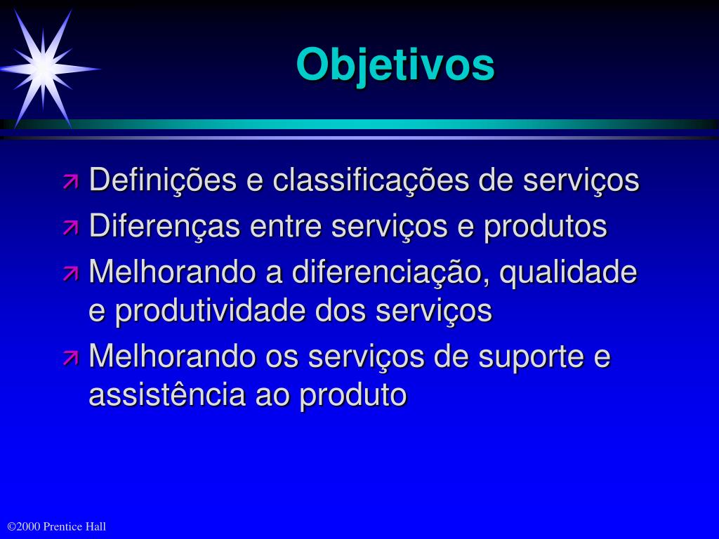 Objetivos • Definições e classificações de serviços • Diferenças entre serviços e produtos • Melhorando a diferenciação, qualidade e produtividade dos serviços • Melhorando os serviços de suporte e assistência ao produto