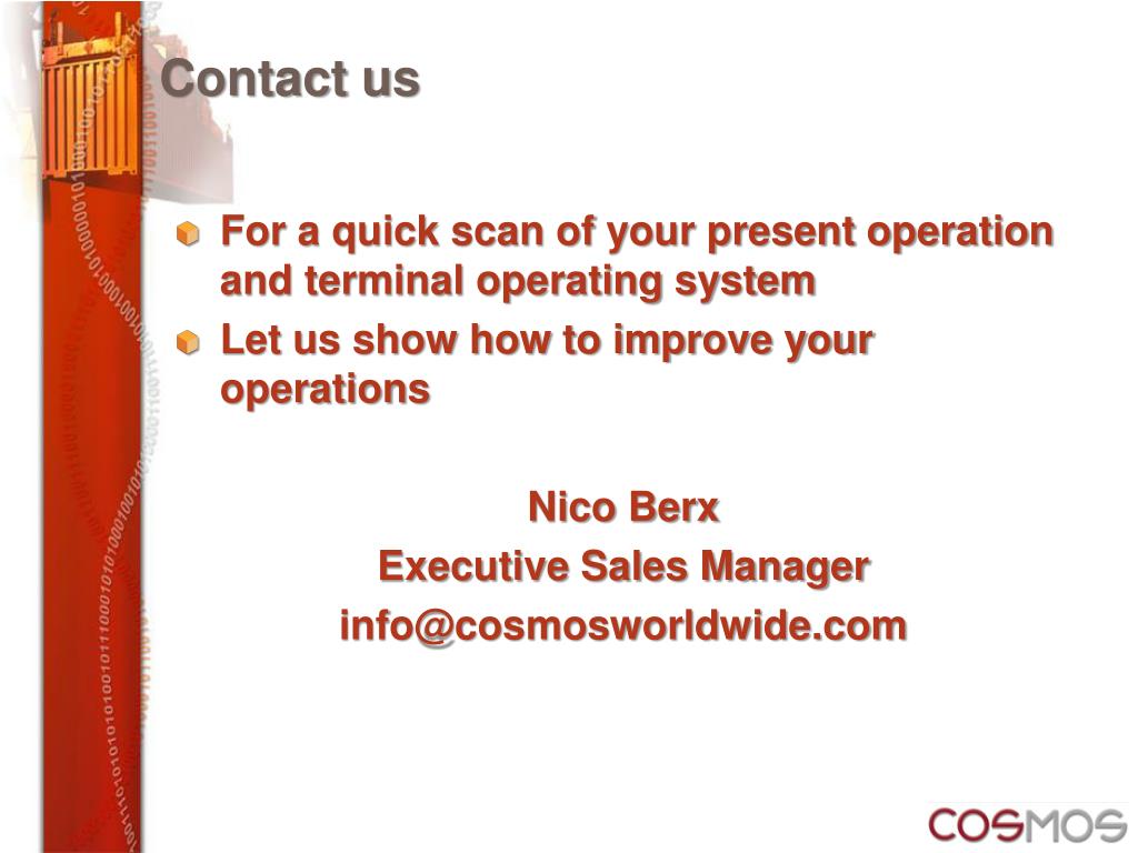 Contact us • For a quick scan of your present operation and terminal operating system • Let us show how to improve your operations Nico Berx Executive Sales Manager info@cosmosworldwide.com