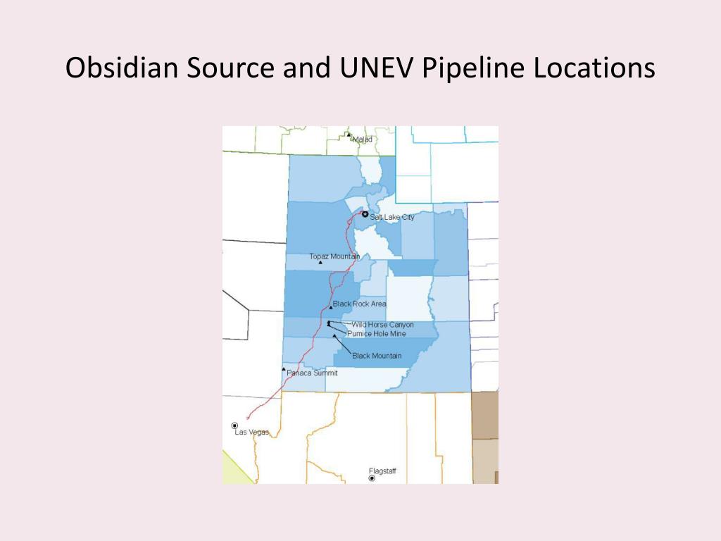 Obsidian Sources Present in UNEV Collection • Black Rock Area • Wild Horse Canyon • Topaz Mountain • Panaca Summit/Modena • Pumice Hole Mine • Black Mountain • Malad