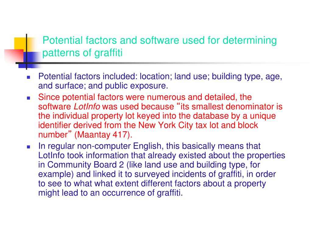 Potential factors and software used for determining patterns of graffiti • Potential factors included: location; land use; building type, age, and surface; and public exposure. • Since potential factors were numerous and detailed, the software LotInfo was used because “its smallest denominator is the individual property lot keyed into the database by a unique identifier derived from the New York City tax lot and block number” (Maantay 417). • In regular non-computer English, this basically means that LotInfo took information that already existed about the properties in Community Board 2 (like land use and building type, for example) and linked it to surveyed incidents of graffiti, in order to see to what what extent different factors about a property might lead to an occurrence of graffiti.