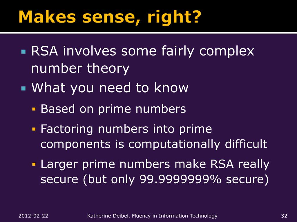 Makes sense, right? • RSA involves some fairly complex number theory • What you need to know • Based on prime numbers • Factoring numbers into prime components is computationally difficult • Larger prime numbers make RSA really secure (but only 99.9999999% secure) Katherine Deibel, Fluency in Information Technology