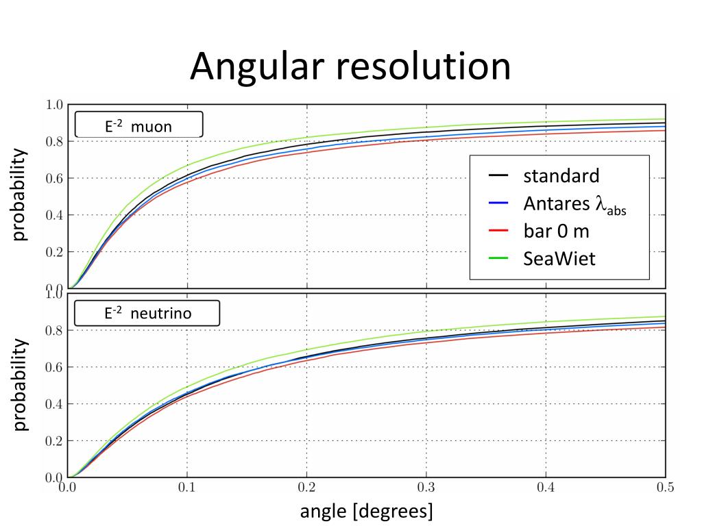Angular resolution E-2 muon standard Antareslabs bar 0 m probability SeaWiet E-2 neutrino probability angle [degrees]