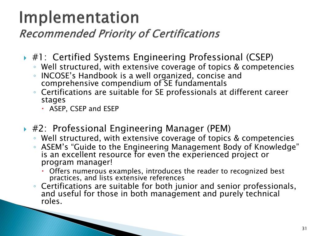ImplementationRecommended Priority of Certifications • #1: Certified Systems Engineering Professional (CSEP) • Well structured, with extensive coverage of topics & competencies • INCOSE’s Handbook is a well organized, concise and comprehensive compendium of SE fundamentals • Certifications are suitable for SE professionals at different career stages • ASEP, CSEP and ESEP • #2: Professional Engineering Manager (PEM) • Well structured, with extensive coverage of topics & competencies • ASEM’s “Guide to the Engineering Management Body of Knowledge” is an excellent resource for even the experienced project or program manager! • Offers numerous examples, introduces the reader to recognized best practices, and lists extensive references • Certifications are suitable for both junior and senior professionals, and useful for those in both management and purely technical roles.
