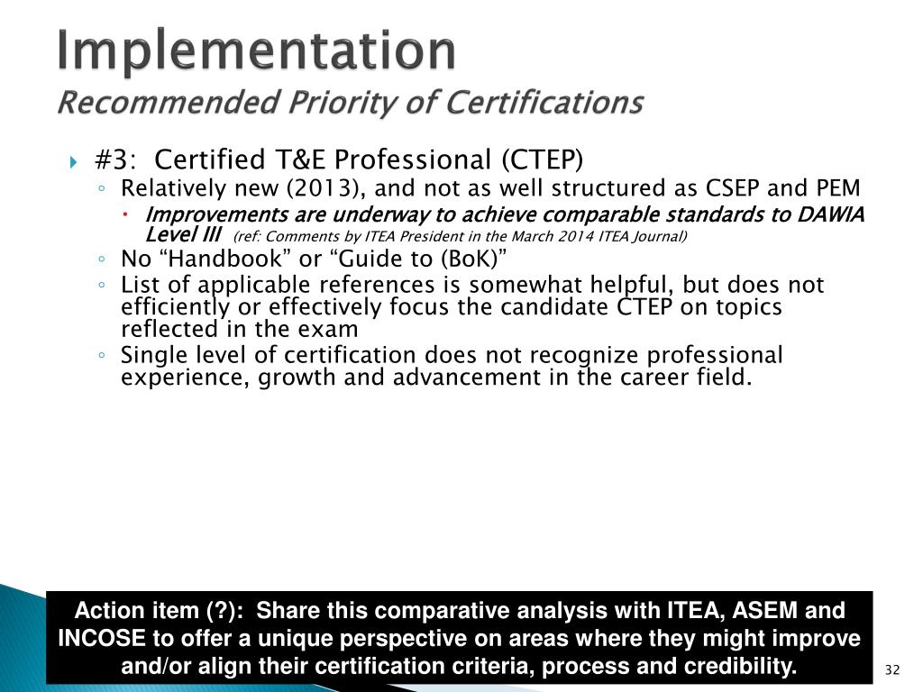 ImplementationRecommended Priority of Certifications • #3: Certified T&E Professional (CTEP) • Relatively new (2013), and not as well structured as CSEP and PEM • Improvements are underway to achieve comparable standards to DAWIA Level III (ref: Comments by ITEA President in the March 2014 ITEA Journal) • No “Handbook” or “Guide to (BoK)” • List of applicable references is somewhat helpful, but does not efficiently or effectively focus the candidate CTEP on topics reflected in the exam • Single level of certification does not recognize professional experience, growth and advancement in the career field. Action item (?): Share this comparative analysis with ITEA, ASEM and INCOSE to offer a unique perspective on areas where they might improve and/or align their certification criteria, process and credibility.