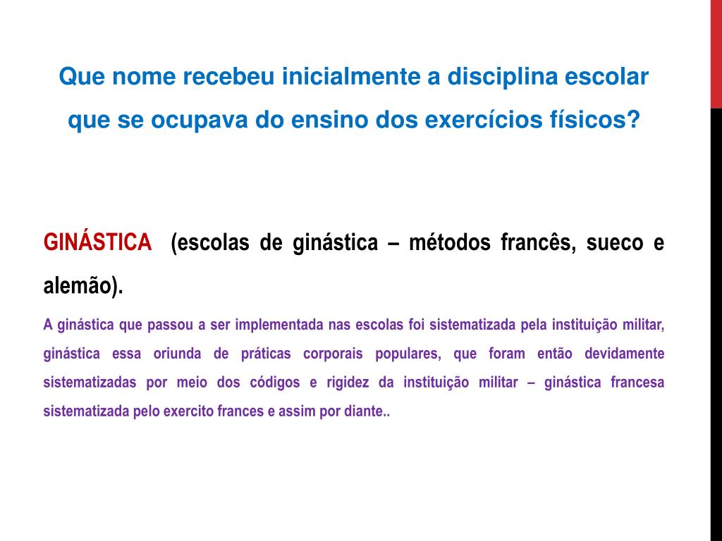 Que nome recebeu inicialmente a disciplina escolar que se ocupava do ensino dos exercícios físicos? GINÁSTICA (escolas de ginástica – métodos francês, sueco e alemão). A ginástica que passou a ser implementada nas escolas foi sistematizada pela instituição militar, ginástica essa oriunda de práticas corporais populares, que foram então devidamente sistematizadas por meio dos códigos e rigidez da instituição militar – ginástica francesa sistematizada pelo exercito frances e assim por diante..