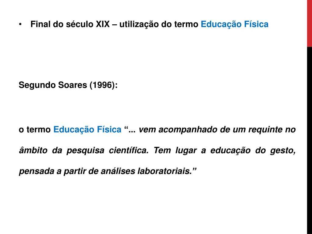 Final do século XIX – utilização do termo Educação Física Segundo Soares (1996): o termo Educação Física “... vem acompanhado de um requinte no âmbito da pesquisa científica. Tem lugar a educação do gesto, pensada a partir de análises laboratoriais.”