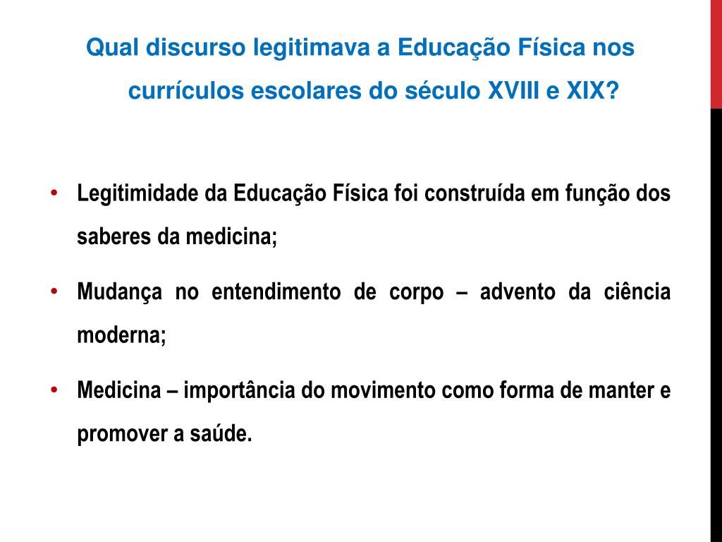 Qual discurso legitimava a Educação Física nos currículos escolares do século XVIII e XIX? • Legitimidade da Educação Física foi construída em função dos saberes da medicina; • Mudança no entendimento de corpo – advento da ciência moderna; • Medicina – importância do movimento como forma de manter e promover a saúde.