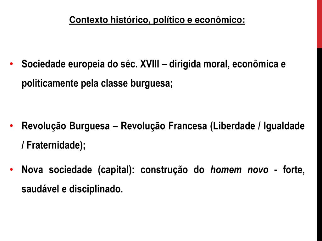 Contexto histórico, político e econômico: • Sociedade europeia do séc. XVIII – dirigida moral, econômica e politicamente pela classe burguesa; • Revolução Burguesa – Revolução Francesa (Liberdade / Igualdade / Fraternidade); • Nova sociedade (capital): construção do homem novo - forte, saudável e disciplinado.