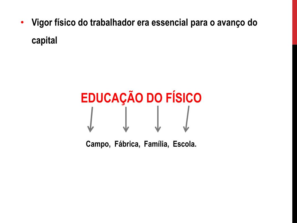 Vigor físico do trabalhador era essencial para o avanço do capital EDUCAÇÃO DO FÍSICO Campo, Fábrica, Família, Escola.