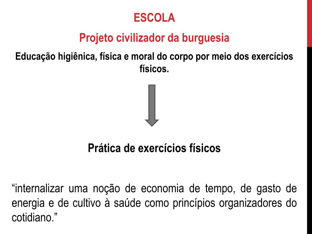 ESCOLA Projeto civilizador da burguesia Educação higiênica, física e moral do corpo por meio dos exercícios físicos. Prática de exercícios físicos “internalizar uma noção de economia de tempo, de gasto de energia e de cultivo à saúde como princípios organizadores do cotidiano.”