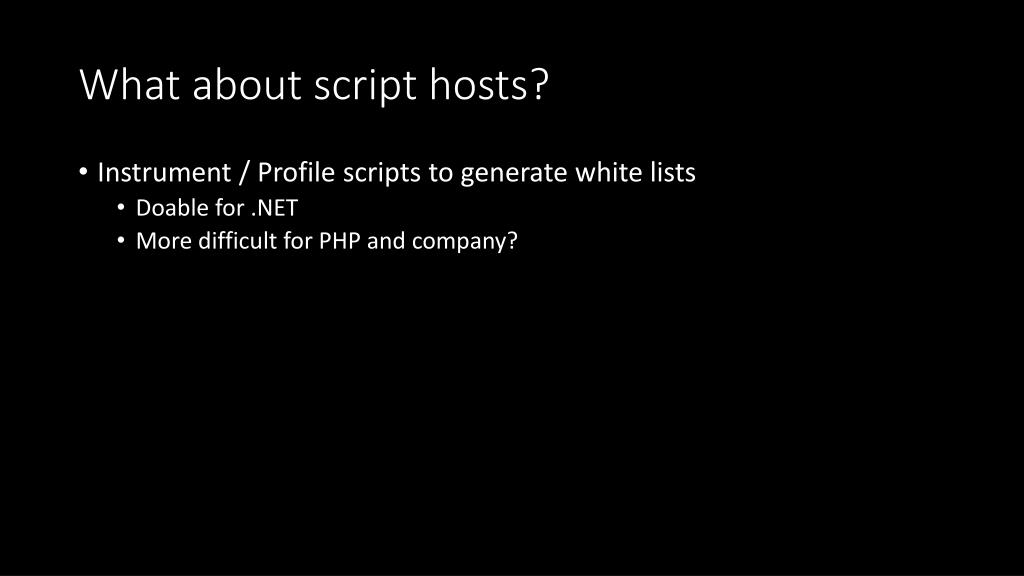 What about script hosts? • Instrument / Profile scripts to generate white lists • Doable for .NET • More difficult for PHP and company?