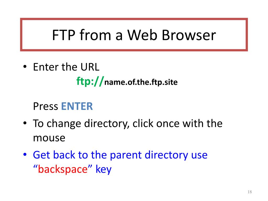FTP from a Web Browser • Enter the URLftp://name.of.the.ftp.sitePress ENTER • To change directory, click once with the mouse • Get back to the parent directory use “backspace” key