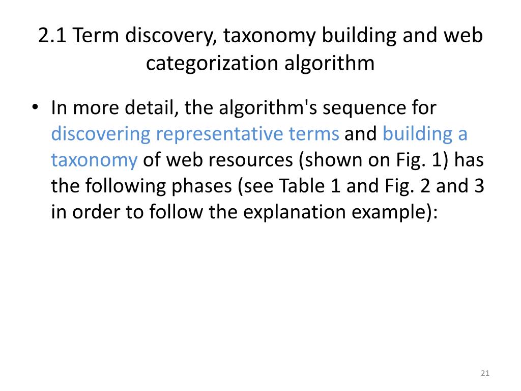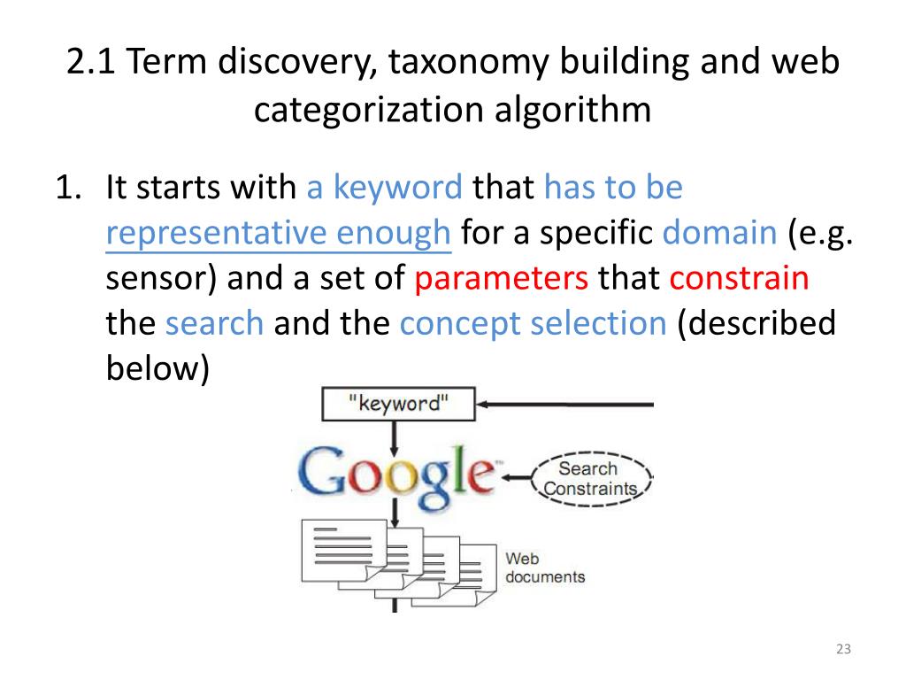 2.1 Term discovery, taxonomy building and web categorization algorithm • Then, it uses a publicly available search engine (Google) in order to obtain the most representative web sites that contain that keyword. The search constraints specified are the following • Maximum number of pages returned by the search engine • Filter of similar sites