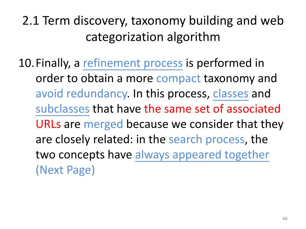 2.1 Term discovery, taxonomy building and web categorization algorithm • Finally, a refinement process is performed in order to obtain a more compact taxonomy and avoid redundancy. In this process, classes and subclasses that have the same set of associated URLs are merged because we consider that they are closely related: in the search process, the two concepts have always appeared together(Next Page)