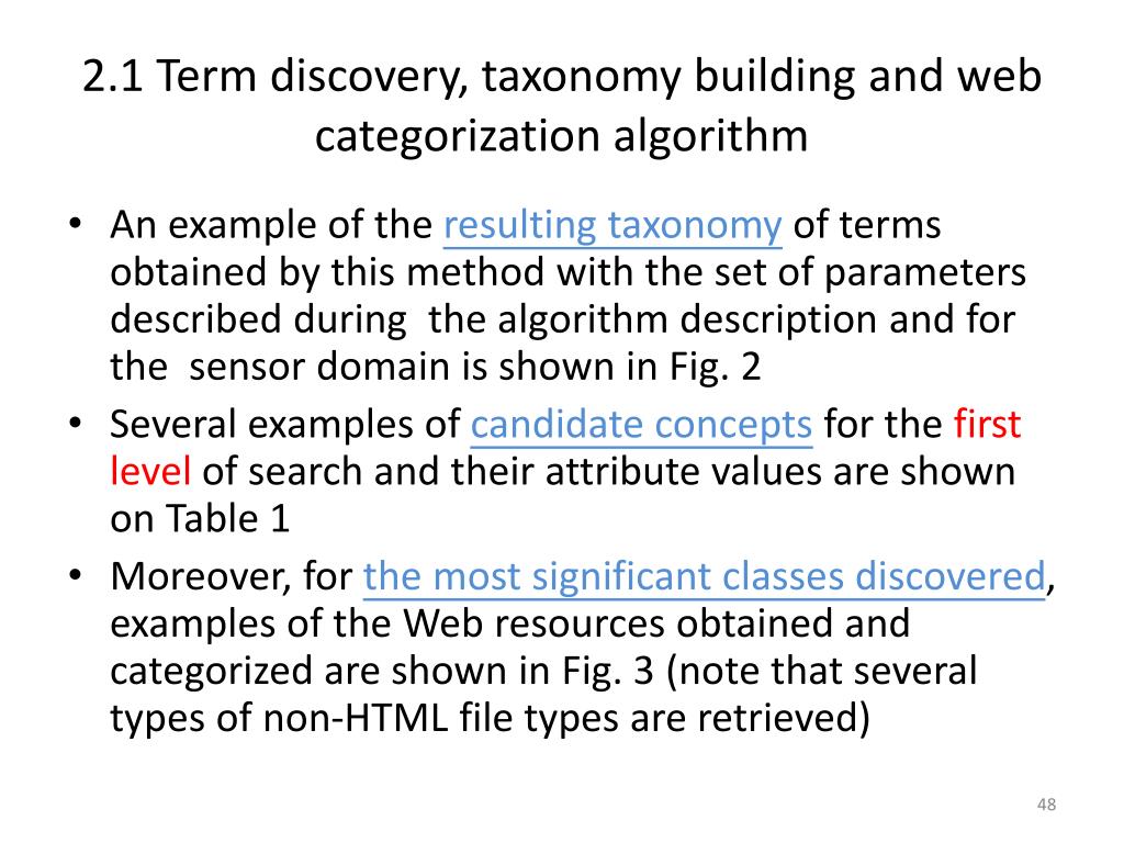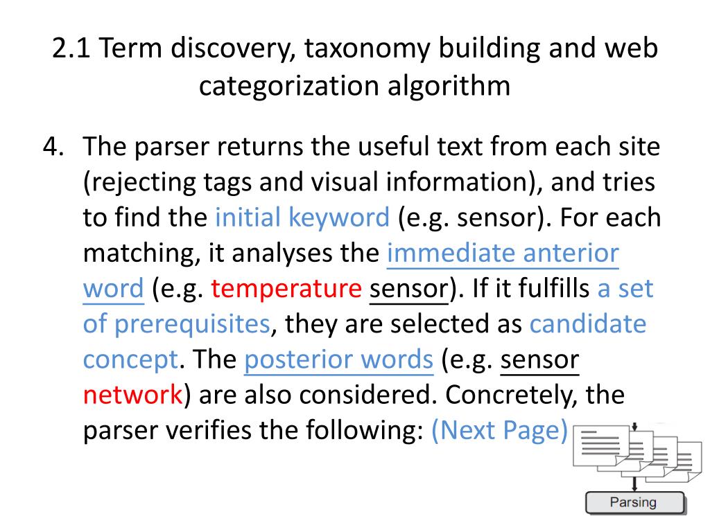2.1 Term discovery, taxonomy building and web categorization algorithm • The parser returns the useful text from each site (rejecting tags and visual information), and tries to find the initial keyword (e.g. sensor). For each matching, it analyses the immediate anterior word (e.g. temperaturesensor). If it fulfills a set of prerequisites, they are selected as candidate concept. The posterior words (e.g. sensornetwork) are also considered. Concretely, the parser verifies the following: (Next Page)