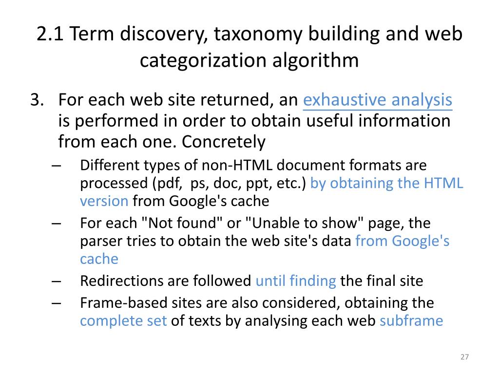 2.1 Term discovery, taxonomy building and web categorization algorithm • For each web site returned, an exhaustive analysis is performed in order to obtain useful information from each one. Concretely • Different types of non-HTML document formats are processed (pdf, ps, doc, ppt, etc.) by obtaining the HTML version from Google's cache • For each "Not found" or "Unable to show" page, the parser tries to obtain the web site's data from Google's cache • Redirections are followed until finding the final site • Frame-based sites are also considered, obtaining the complete set of texts by analysing each web subframe