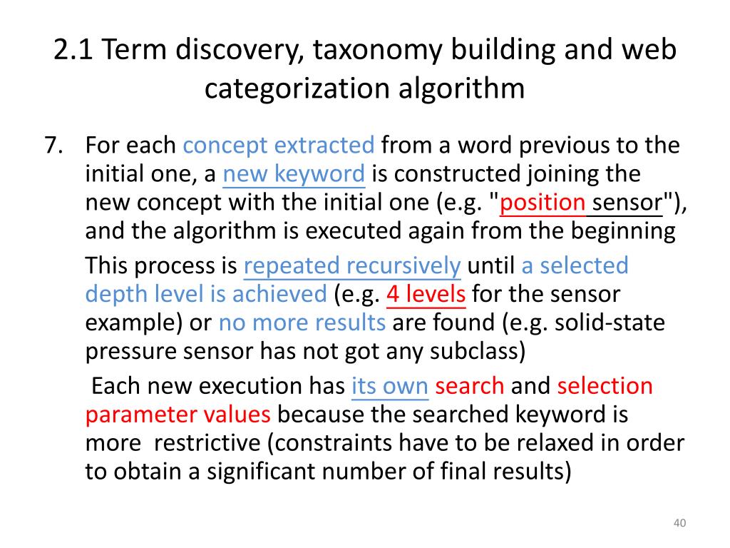 2.1 Term discovery, taxonomy building and web categorization algorithm • For each concept extracted from a word previous to the initial one, a new keyword is constructed joining the new concept with the initial one (e.g. "position sensor"), and the algorithm is executed again from the beginning This process is repeated recursively until a selected depth level is achieved (e.g. 4 levels for the sensor example) or no more results are found (e.g. solid-state pressure sensor has not got any subclass) Each new execution has its ownsearch and selection parameter values because the searched keyword is more restrictive (constraints have to be relaxed in order to obtain a significant number of final results)