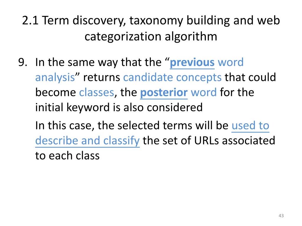 2.1 Term discovery, taxonomy building and web categorization algorithm • In the same way that the “previous word analysis” returns candidate concepts that could become classes, the posterior word for the initial keyword is also considered In this case, the selected terms will be used to describe and classify the set of URLs associated to each class