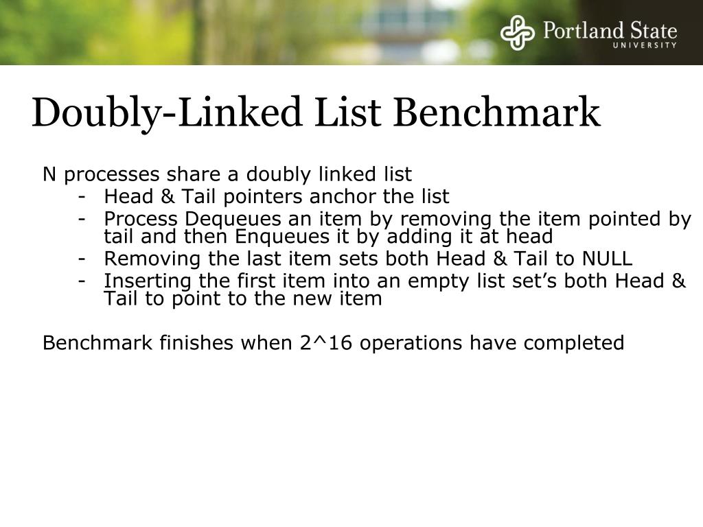 Doubly-Linked List Benchmark • N processes share a doubly linked list • Head & Tail pointers anchor the list • Process Dequeues an item by removing the item pointed by tail and then Enqueues it by adding it at head • Removing the last item sets both Head & Tail to NULL • Inserting the first item into an empty list set’s both Head & Tail to point to the new item • Benchmark finishes when 2^16 operations have completed